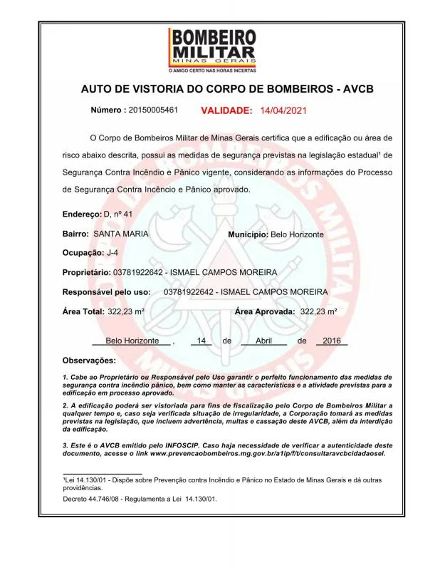 O auto de vistoria de corpo de bombeiros (AVCB) é um documento técnico emitido pelo Corpo de Bombeiros após uma inspeção presencial.